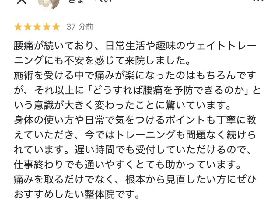 施術を受ける中で痛みが楽になったのはもちろんですが、それ以上に「どうすれば腰痛を予防できるのか」という意識が大きく変わったことに驚いています。