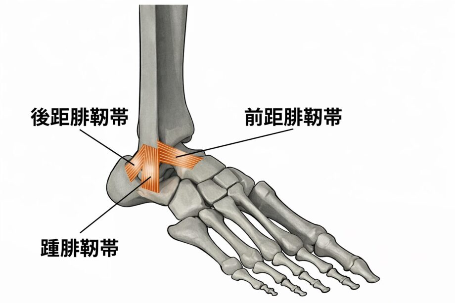 内側にひねることで起こる内反捻挫では、外側の靭帯、とくに前距腓靭帯が傷つきやすいのが特徴です。