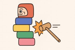 また、日常の姿勢も大きく影響します。背中を丸めて座る姿勢が続くと、腰の関節に負担がかかり、それが積み重なることで変性(すり減り)が進みやすくなります。そうすると、まるで 「今にも落ちそうなだるま落とし」 のように、骨が不安定な状態に近づいていきます。