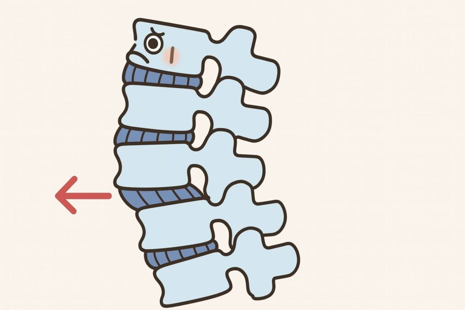 腰椎すべり症は、腰椎(腰の骨)が本来ある位置から前方へずれてしまうことで、腰の痛みやお尻・太ももの痛みやしびれが生じ、歩行距離が短くなったり、立っているのがつらく感じたりする症状です。