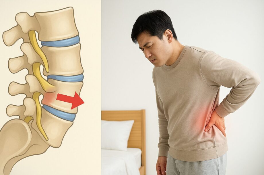 腰椎すべり症は、腰椎(腰の骨)が本来ある位置から前方へずれてしまうことで、腰の痛みやお尻・太ももの痛みやしびれが生じ、歩行距離が短くなったり、立っているのがつらく感じたりする症状です。
