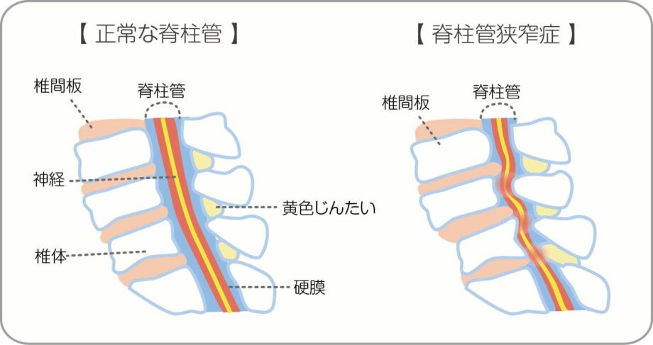 脊柱管狭窄症は、脊髄神経の通り道(脊柱管)がせまくなることで起こる症状です。