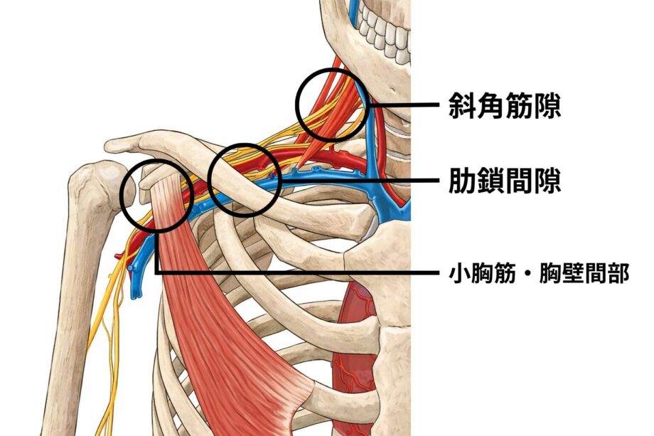 腕神経叢(C5〜T1からなる腕へ向かう神経の束)と鎖骨下動静脈(腕へ血液を送る血管)は、胸郭の上の入り口部分で、第1肋骨の上面と鎖骨の間を通って上肢へ向かいます。