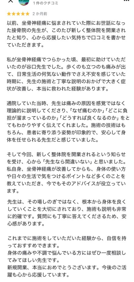 先生は、その場しのぎではなく、根本から身体を良くしていくことを大切にされており、施術も説明も非常に的確です。